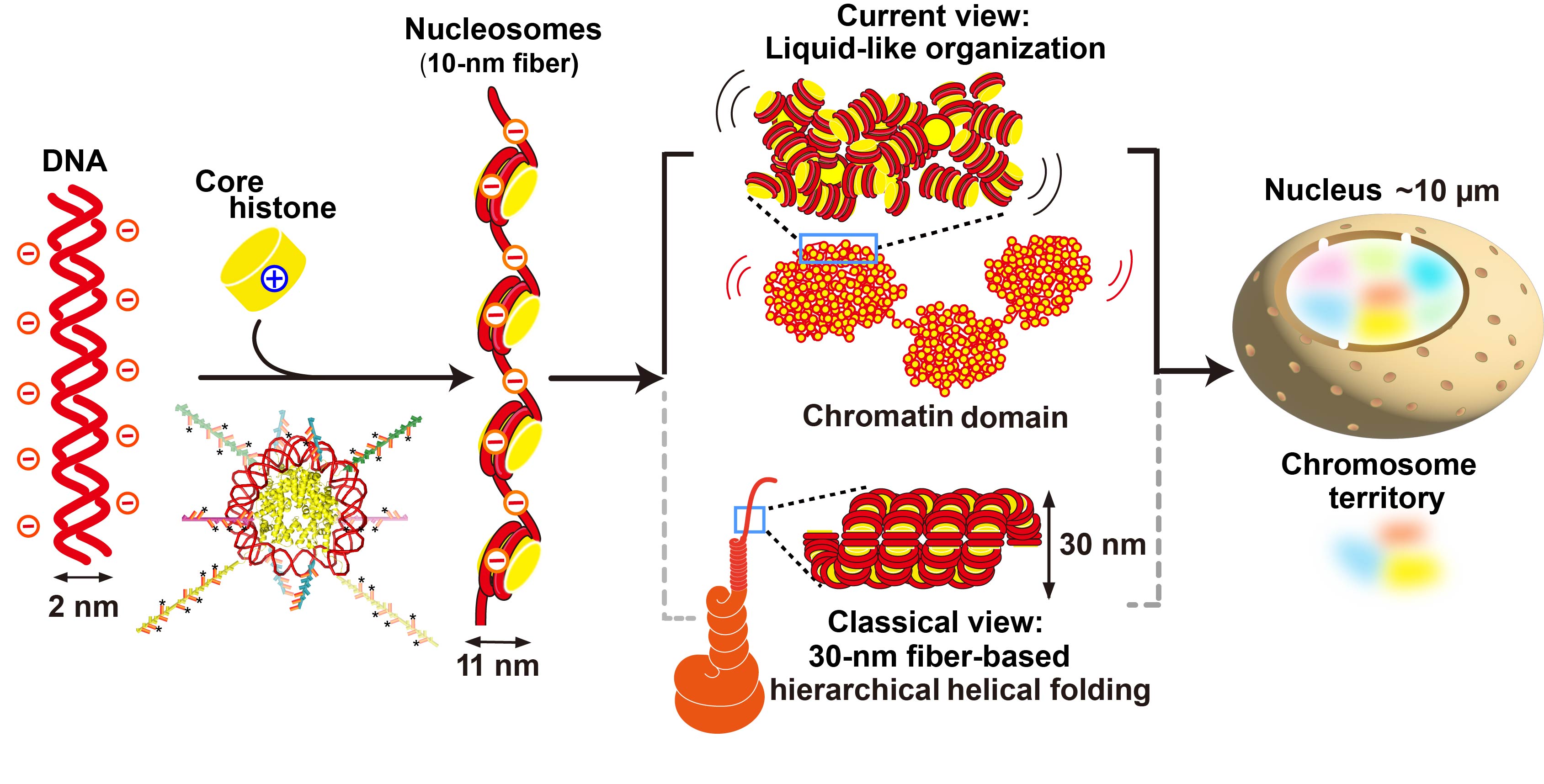 Figure 1.Schematic of DNA, nucleosomes, and chromatin domains. The emerging model of chromatin organization in living cells is shown in the upper panel, whereas the classical model is shown in the lower panel. Reproduced from Maeshima, PJASB 2025.