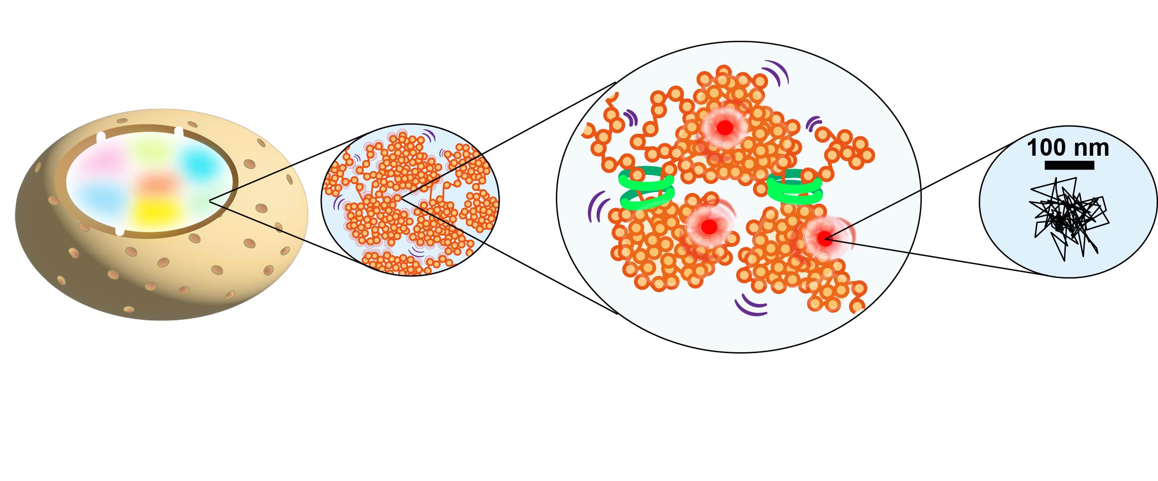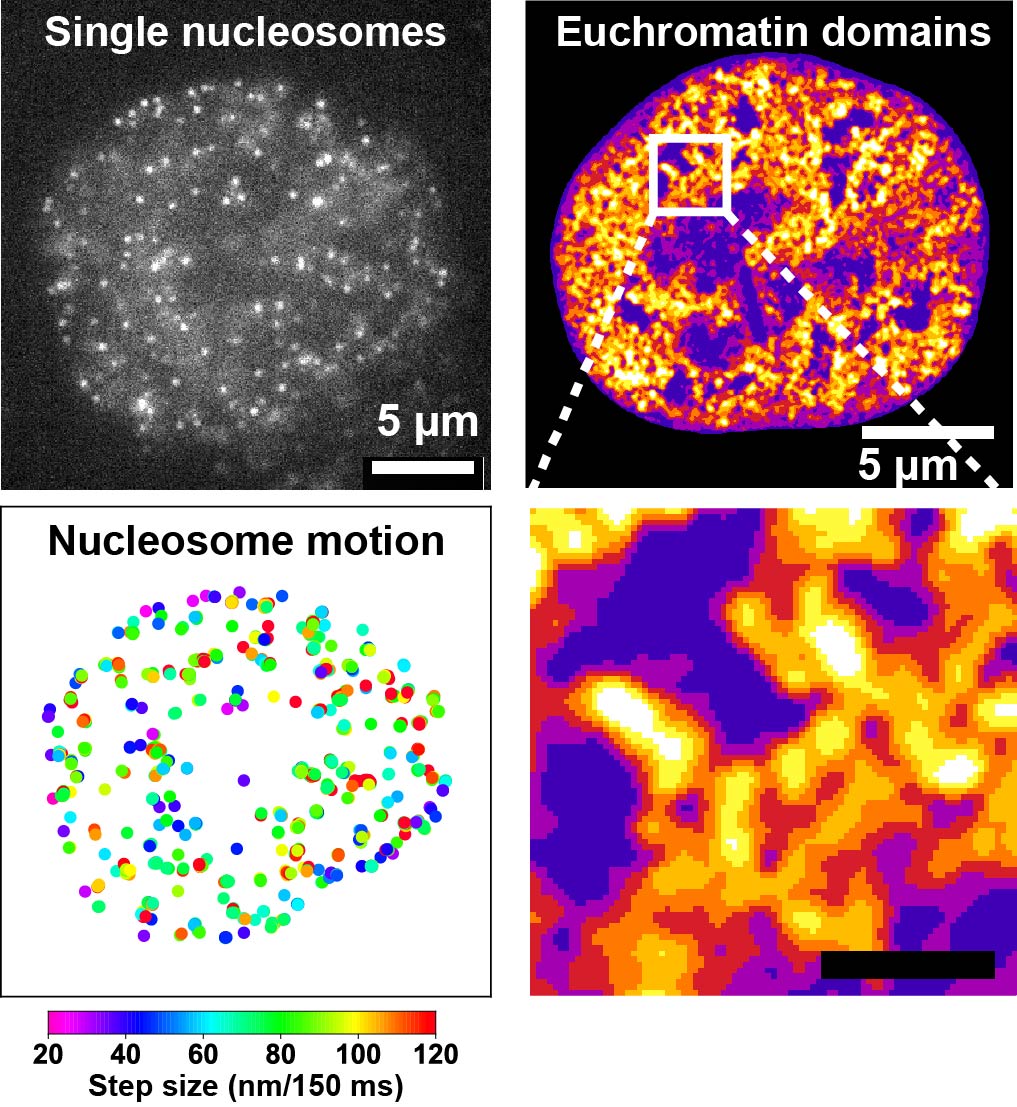 Figure 3.We visualize the structures of euchromatin and heterochromatin domains in living cells and track the motion of nucleosomes and other proteins using the new microscopy system. We then analyze trajectories of nucleosomes and proteins (right).