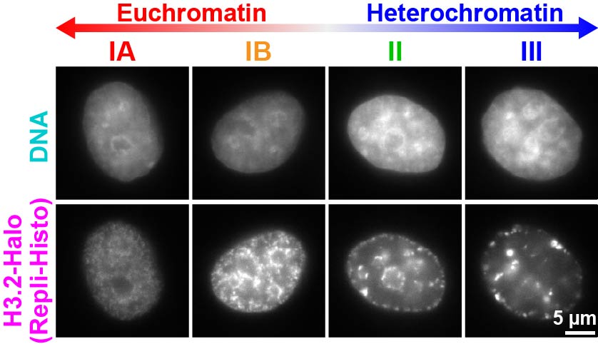 Figure 4.Repli-Histo labeling enables specific labeling of euchromatin and heterochromatin. Upper: DNA staining by DAPI. Lower: Repli-Histo labeling. Chromatin can be labeled in four classes—IA and IB (euchromatin) and II and III (heterochromatin)(Minami et al., Science Adv 2025).